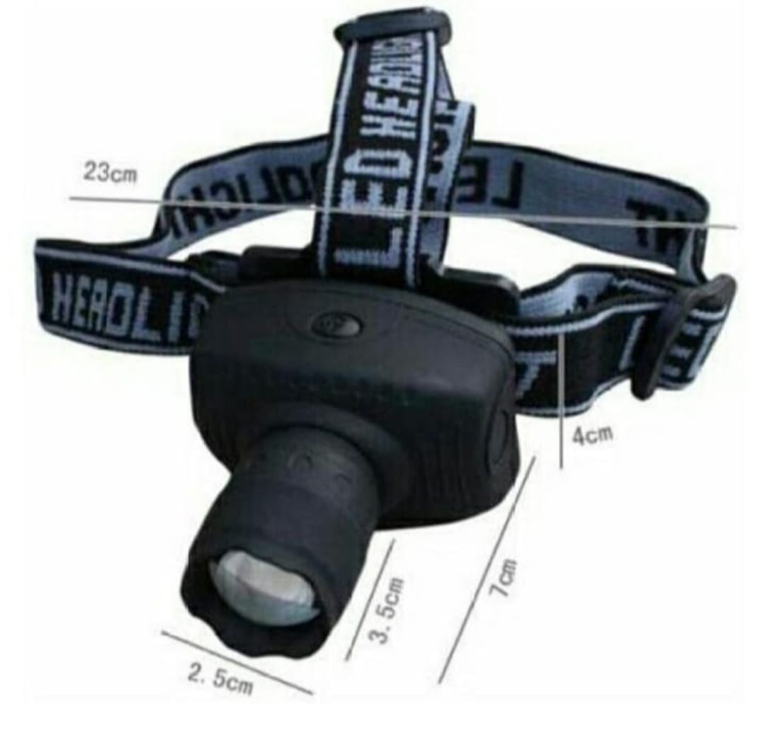 Senter ini memiliki tali pengikat kepala yang bertuliskan “HEROLID ED HEADLIG”.